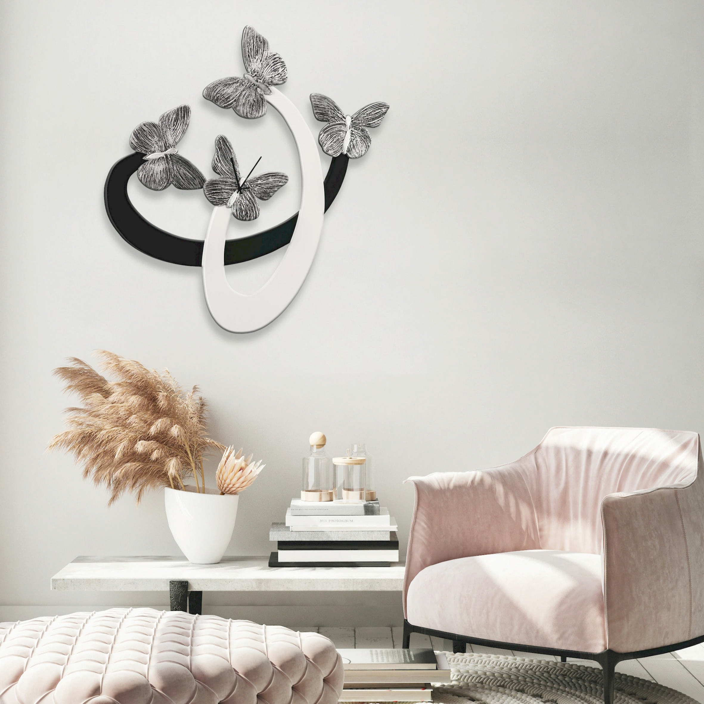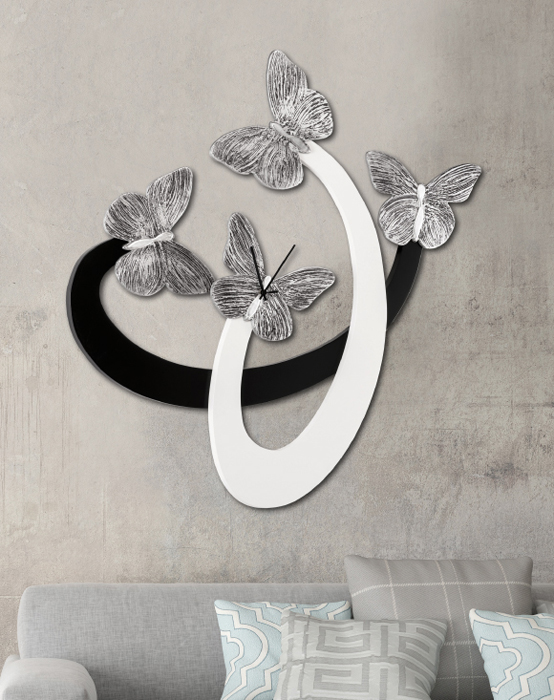 Uhr mit eleganten Schmetterlingen aus Silberblättern, verbunden durch ein Zusammenspiel aus originalen elfenbeinfarbenen und schwarzen Bändern.