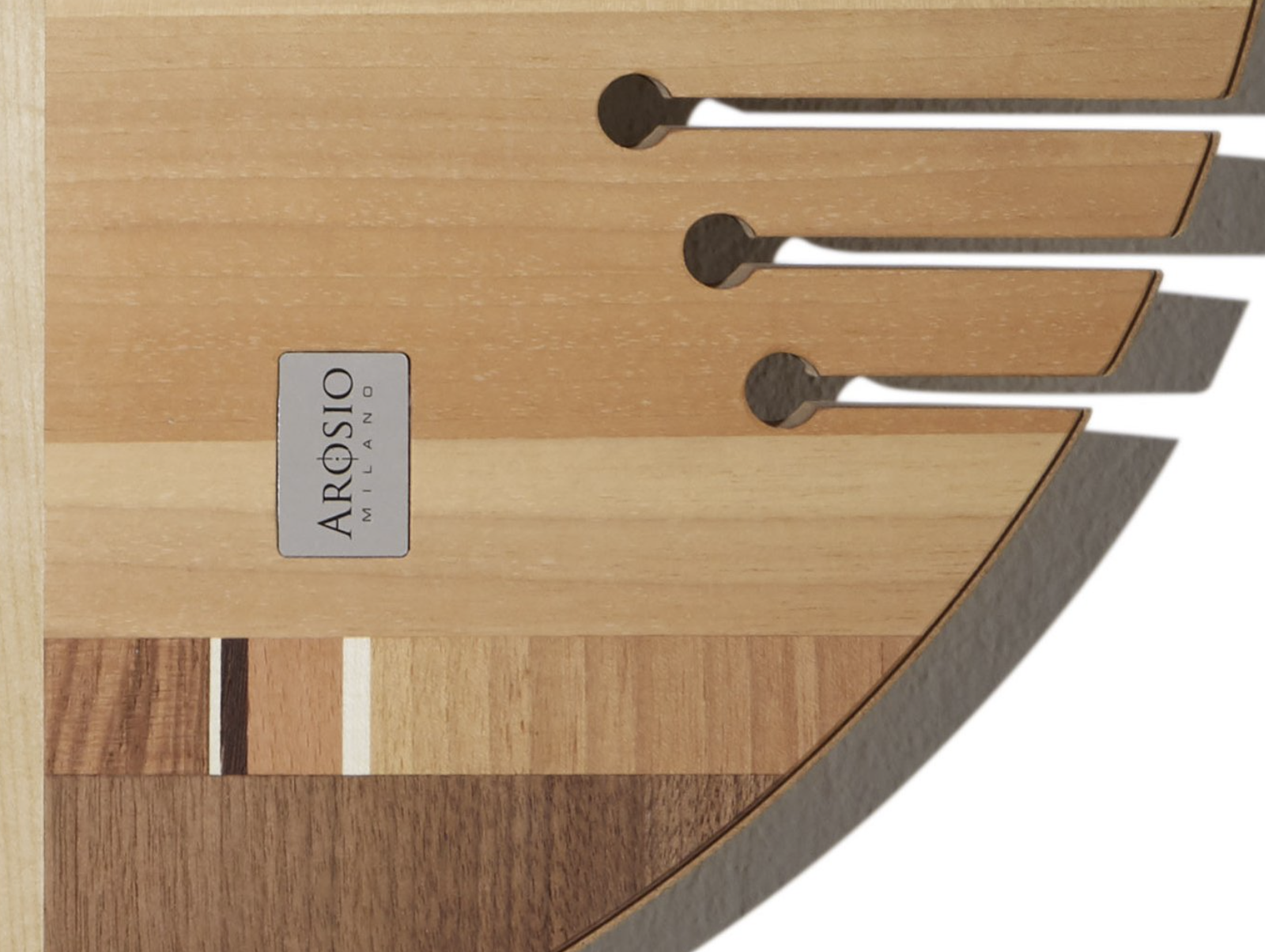 Die Außenfläche ist mit verschiedenen wertvollen Essenzen eingelegt, wie Ahorn, nationaler Nussbaum, Kastanie, Canaletto-Nussbaum. Die Oberflächenbeschaffenheit ist naturmatt. Die innere Struktur besteht aus Zellstoff.