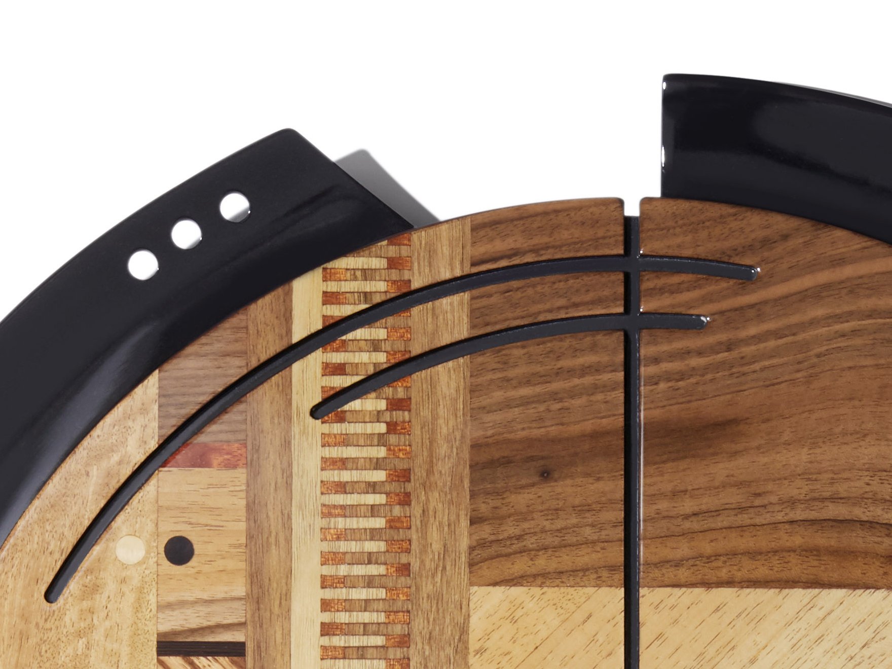 Die äußere Oberfläche ist mit verschiedenen kostbaren Essenzen eingelegt, wie z. B. Ulmenstrauch, Rosenholz, rote Bobinga, italienische Walnuss, Zebrano, Walnussstrauch. Die Oberflächenbeschaffenheit ist hochglänzend. Die innere Struktur besteht aus Zellstoff.