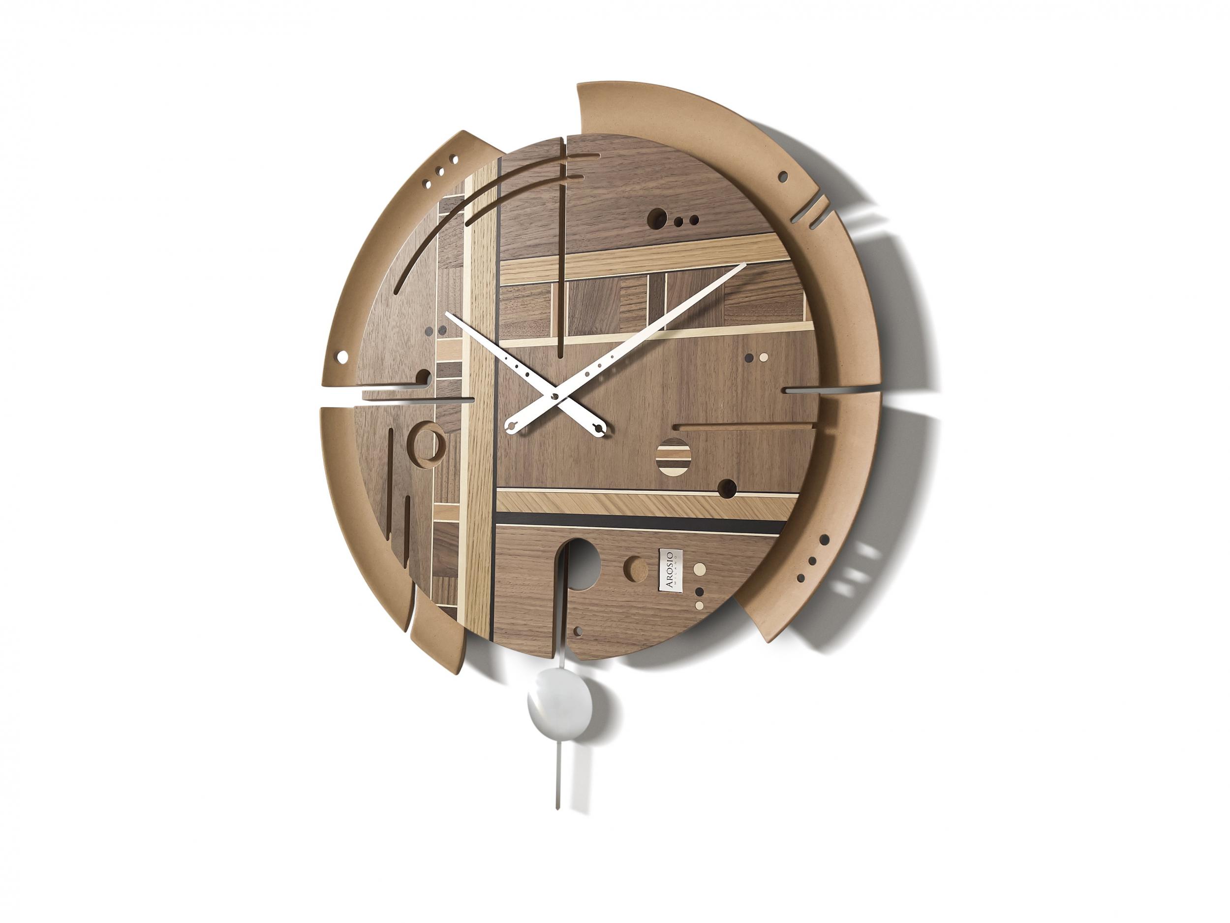 Handeingelegtes Zifferblatt mit modernem und abstraktem Design in 5 verschiedenen Holzarten, darunter Canaletto Nussbaum, dann Eiche, Wenge, Ahorn, Buche und absolut schwarz gebeiztes Holz. Die geschnitzte Struktur aus honigfarbenem Holzzellstoff ist aus dem Vollen gefräst. Matte Malerei.