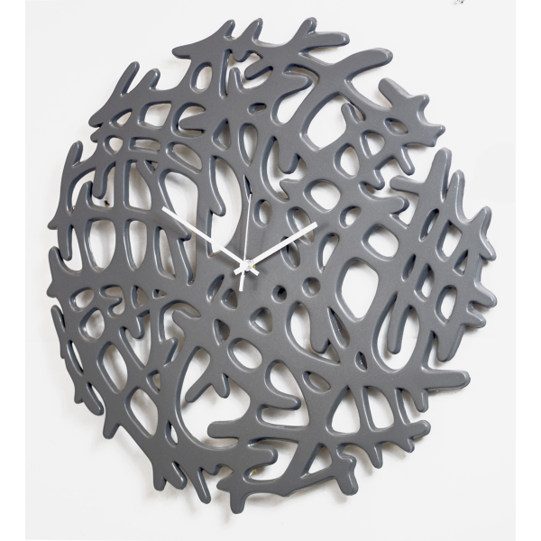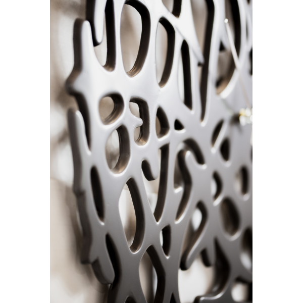 Uhr mit perforierter Struktur aus Verbundkeramik. Quarzgrau lackiert und verchromte Zeiger.
