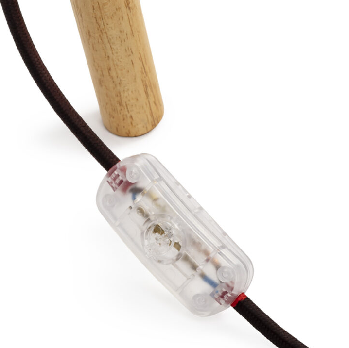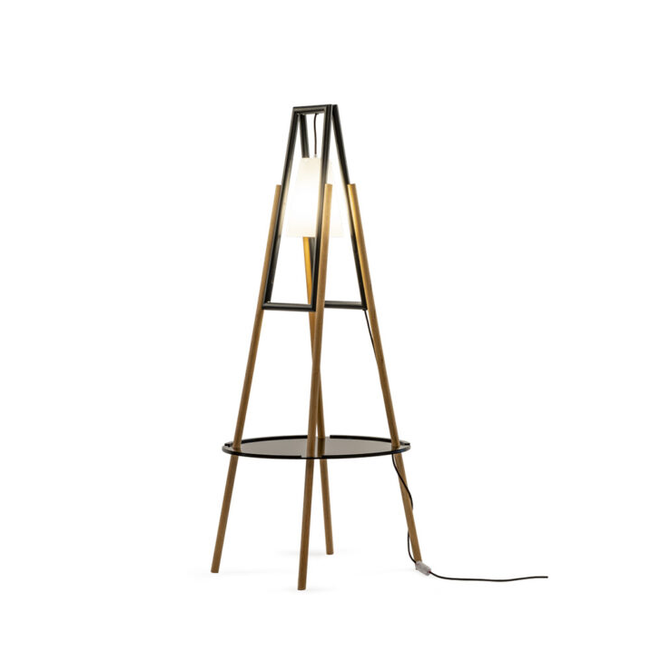 Die Struktur kombiniert Holz und Metall, während der Lampenschirm aus Polypropylen besteht.