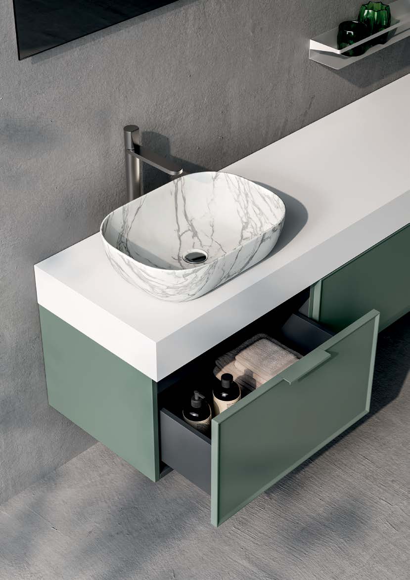 Die Komposition Venere 102 von Oltrebagno stellt die perfekte Synthese zwischen zeitgenössischer Ästhetik und Funktionalität dar. Sie wurde entworfen, um das Badezimmer elegant einzurichten und besteht aus einem Hängeschrank mit hochwertiger Verarbeitung, kombiniert mit einem integrierten Waschbecken mit minimalistischem Design und einem passenden Spiegel.