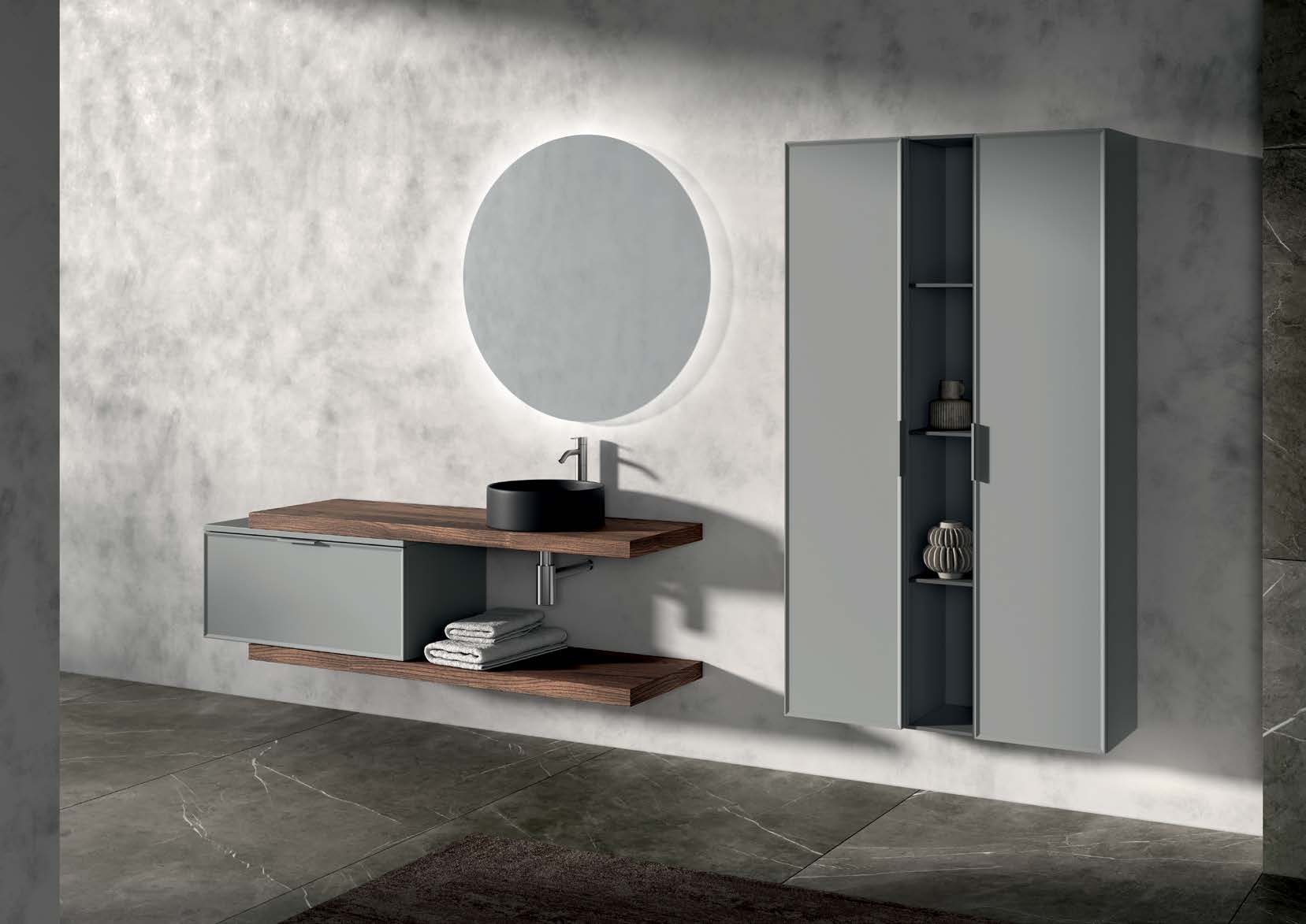 Ausgestattet mit einem integrierten Waschbecken und Soft-Close-Schubladen bietet Venere 106 einen komfortablen und gut organisierten Stauraum, ideal für ein praktisches und ordentliches Badezimmer. Die essentiellen Linien und eleganten Oberflächen passen sich perfekt an moderne Kontexte an und unterstreichen den Stil der Umgebung.