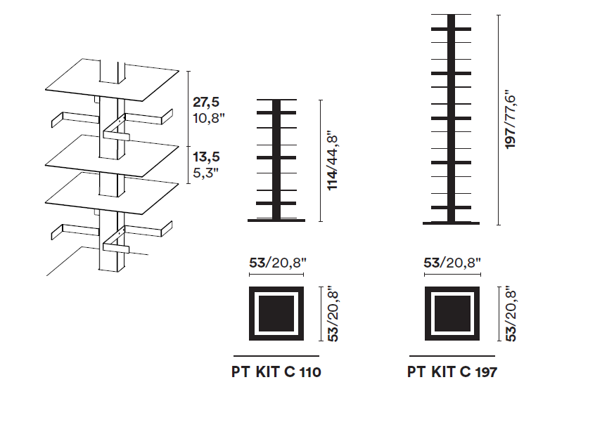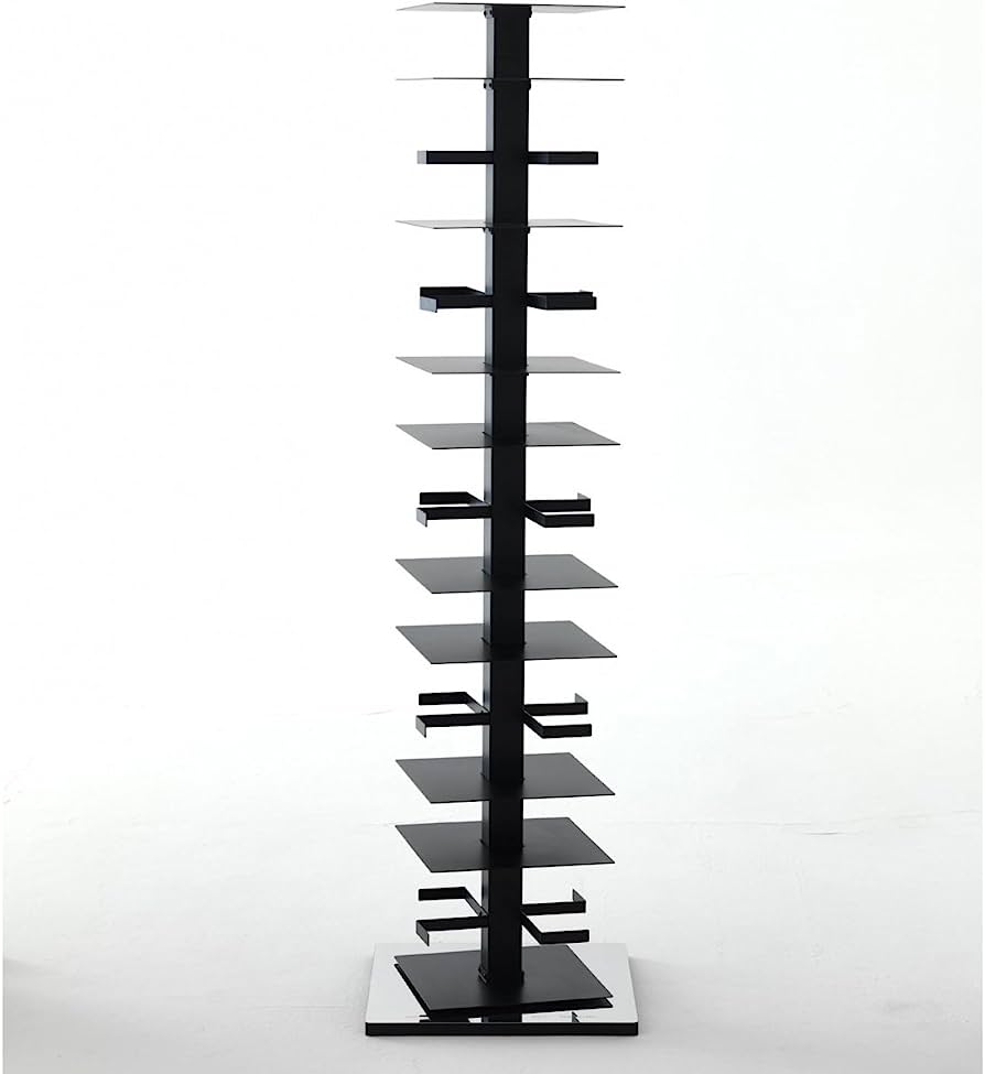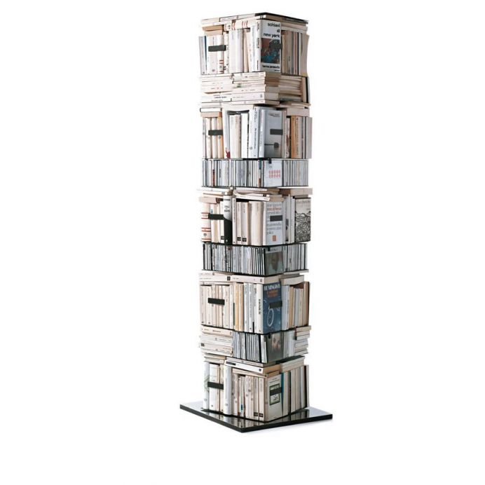 Vertikales freistehendes und um 360 ° drehbares Bücherregal. Basis mit der Signatur des Designers graviert. Erhältlich in drei verschiedenen Versionen: Kit A, Kit B, Kit C. Oberfläche: Struktur und Regale aus weiß oder schwarz lackiertem Metall. Basis aus poliertem Edelstahl für die schwarze Version und weiß lackiert für die weiße Version. Zubehör: Verlängerung aus weiß oder schwarz lackiertem Metall. Magnet stoppt CD. Abmessungen: 52x52xh197 cm Der Preis bezieht sich auf Einstellung C, bestehend aus 5 Regalen mit einem Abstand von 26 cm und 4 Regalen mit einem Abstand von 13 cm. Vertikale und horizontale Positionierung von Büchern. Über 295 Gesamtvolumen. Geben Sie per E-Mail an info@tecnoarredo3.com an, ob Sie die Variante WHITE BASE WHITE oder BLACK BASE EDELSTAHL wünschen