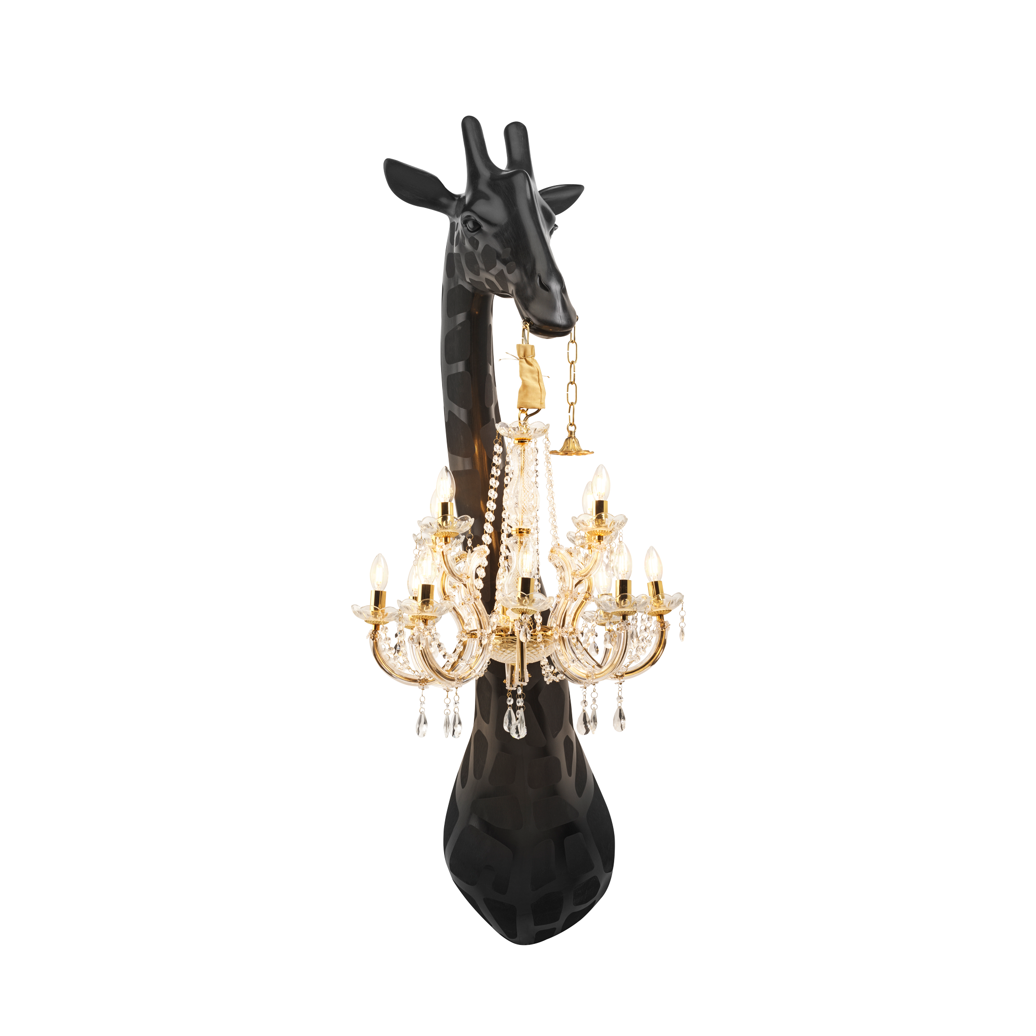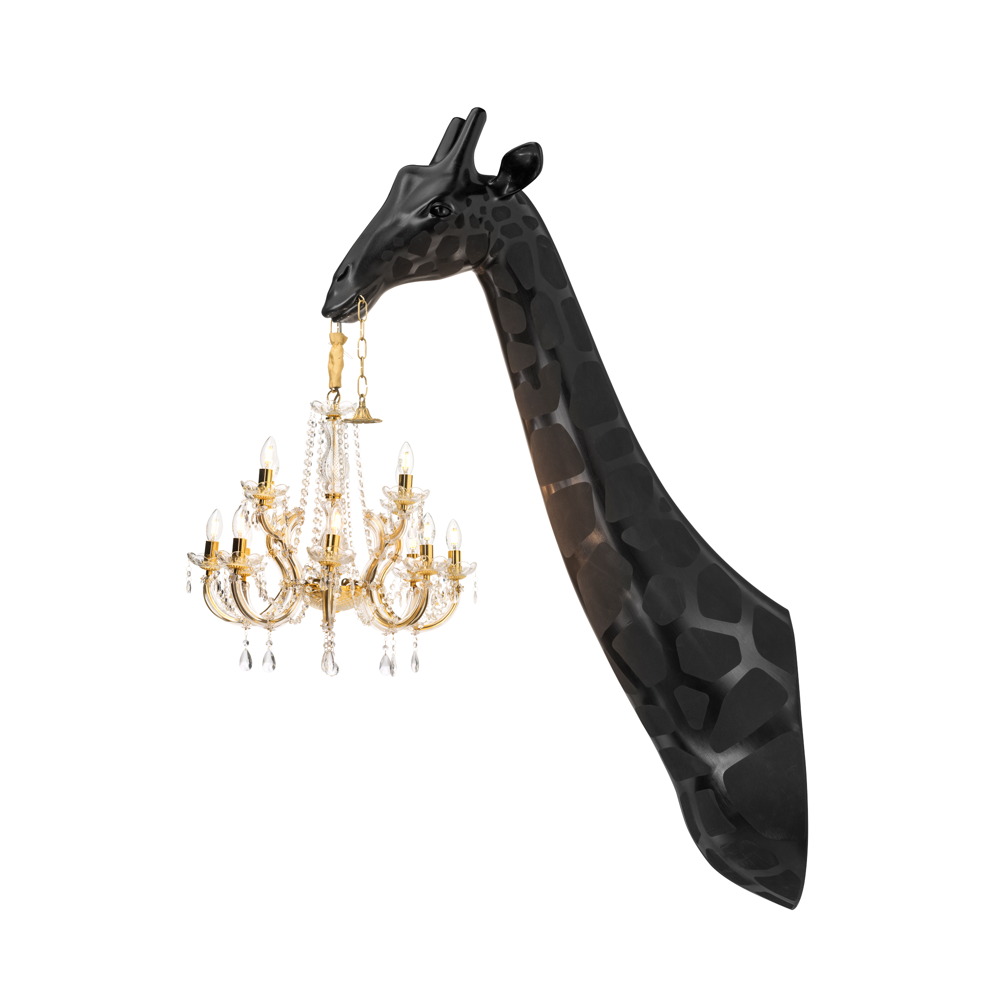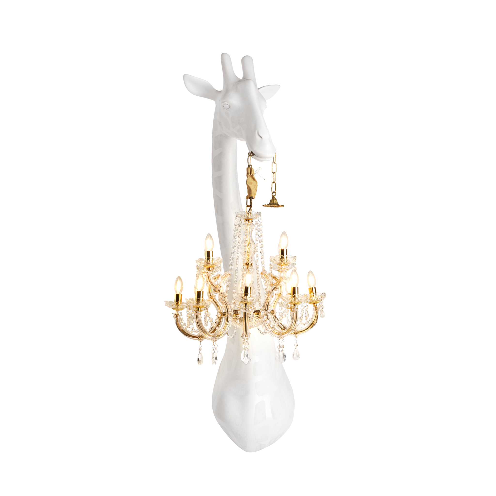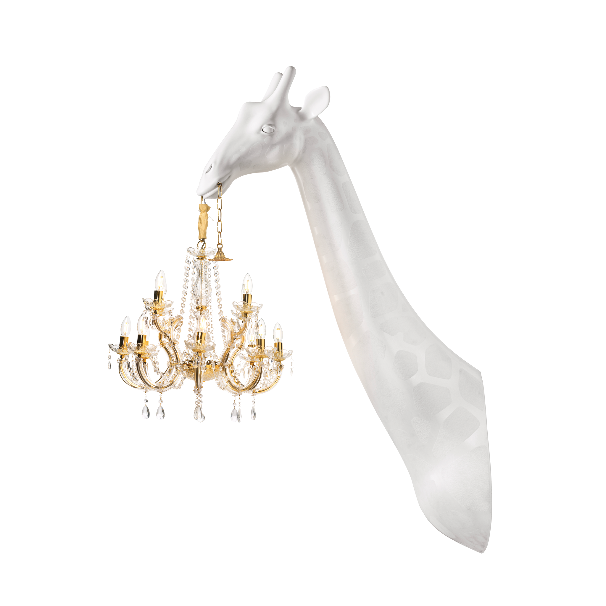 Die Applikation Giraffe In Love, entworfen von Marcantonio, ist ein Giraffenhals, der einen klassischen Kronleuchter im Marie-Thérèse-Stil in einer Wandversion trägt, mit der Sie jedem Wohnraum Ironie und Leichtigkeit verleihen können. Kommt mit einem Metallständer zum Aufhängen an der Wand.
